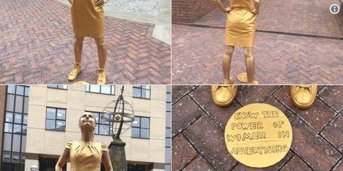 Eine Frau besprüht sich mit Goldfarbe und stellt sich in Pose der berühmten Statue "Fearless Girl" aus New York vor die McCann Worldwide Agentur in Bristol. Die Aktion ist eine Bewerbung. Die Frau bekommt den Job.