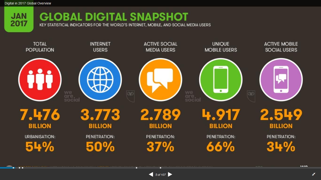 Eine Präsentation der Ergebnisse zur digitalen Nutzung 2017 ist auf Slideshare verfügbar: http://www.slideshare.net/wearesocialsg/digital-in-2017-global-overview