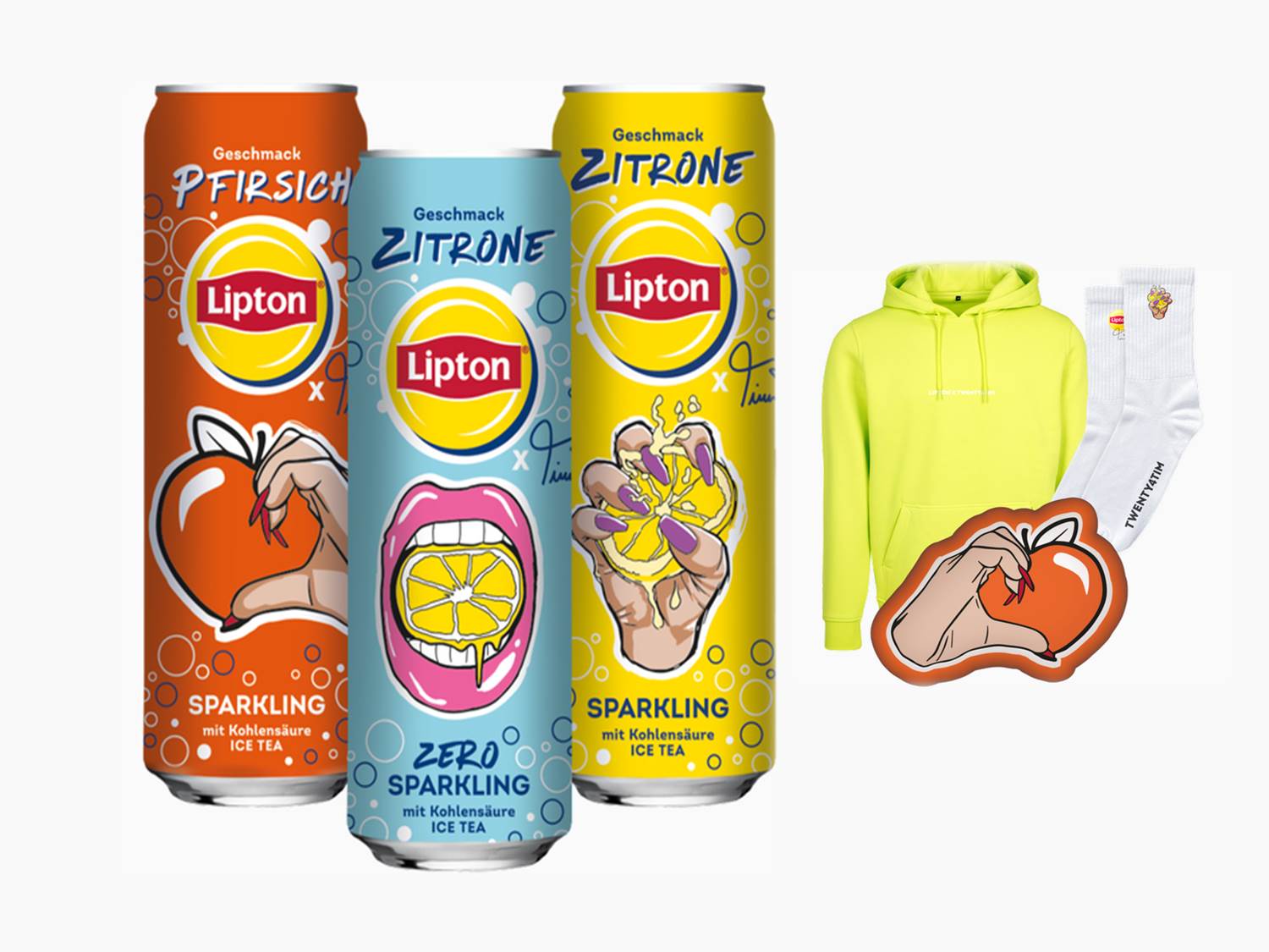 Bild: Die neuen CoCreation Dosen von Lipton x Twenty4tim – und die passenden Accessoires | (c) PepsiCo – Lipton – Twenty4tim