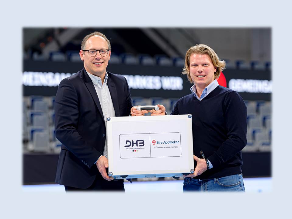Bild: V. l. Mark Schober vom DHB und Dr. Jan-Florian Schlapfner vom Zukunftspakt Apotheke / IhreApotheken.de ist offizieller Partner des Deutschen Handball Bundes und von handball.net (Bildrechte: Marco Wolf | Fotograf: Marco Wolf)