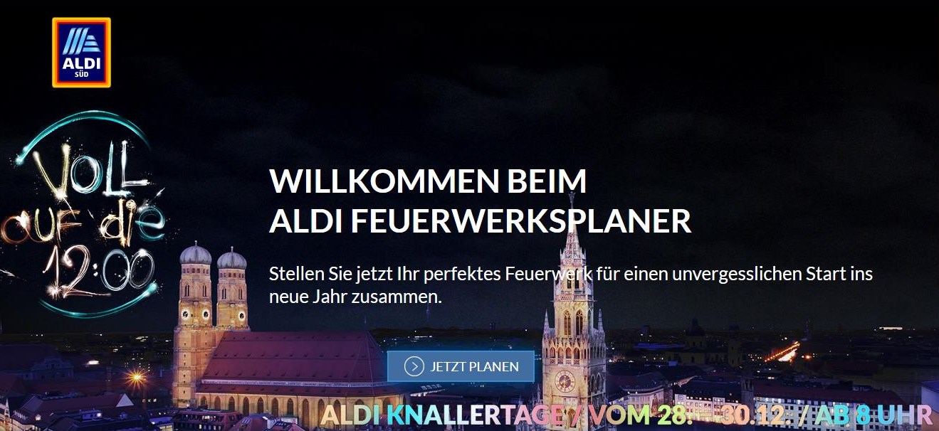 Zum Verkaufsstart des Feuerwerksverkaufs im Handel haben sich die Discounter ALDI Nord und ALDI SÜD etwas Besonderes einfallen lassen: Mit Hilfe eines Feuerwerkskonfigurators können sich Kunden unter www.feuerwerksplaner.de ihre Silvesterknaller zusammenstellen und online in Form einer Vorschau ansehen. Ein Image-TV-Spot sowie zwei Produktspots begleiten den Start des Verkaufs.