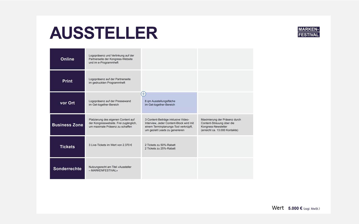 Grafik: Große Chance auf eine starke Präsenz beim Markenfestival 2023. Dieses Ausstellerpaket im Wert von 5.000 EUR (exkl. Print) wird an ein Start-Up verlost. Am besten sofort mitmachen und am 31.08. als Aussteller in Düsseldorf dabei sein.