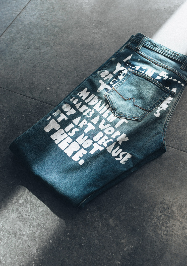 "OPEN – CLOSE" – dieser Hinweis ziert z.B. die Reißverschluss-Gegend der neuen ALBERTO Vintage Denims. Und es gibt weitere kunstvolle Applikationen. "Ich habe mich richtig ausgetobt", sagt Can Demirezen, dessen Kunst inspiriert ist von Hip-Hop-Designs und Street Art. Die rechten Oberschenkel etwa zieren übergroße Angaben wie Artikelnummer, Größe und Style. Die Gesäßtaschen wurden abgetrennt und leicht versetzt wieder angenäht. Dabei wurden teilweise Statements, die auf die Hosen mit hochwertiger, beständiger Textilfarbe und im Siebdruckverfahren angebracht wurden, überdeckt.