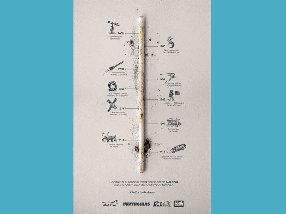 Auf den Plakaten im Stil einer Infografik heißt es auf Spanisch: "Es dauerte rund 500 Jahre den Panama-Kanal aufzubauen, so lange belastet ein Strohhalm die Umwelt", "Den Weltraum zu erobern dauert rund 500 Jahre, so lange verschmutzt ein Strohhalm die Umwelt," und "Es brauchte 500 Jahre, damit Du so kommunizieren kannst, wie Du es heute tust. So lange schadet ein Strohhalm der Natur." Der Hashtag #SinCarrizoPorFavor (dt. #OhneStrohhalmBitte) findet sich auf allen Motiven wieder und ruft dazu auf, Plastikstrohhalme zu vermeiden.