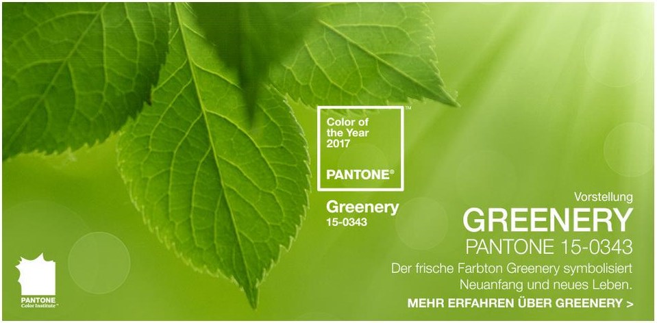 PANTONE®, internationaler Anbieter professioneller Farbstandards für die Design-Branchen, gibt "Greenery" (PANTONE 15-0343) als Pantone-Farbe des Jahres 2017 bekannt. Der frische gelbgrüne Farbton symbolisiere das Wiedererwachen der Natur im Frühling und sei ein Sinnbild für Neuanfang und neues Leben, so das Unternehmen. Greenery habe die Anmutung von jungen, frischen Blättern und Trieben und vermittele Menschen das Gefühl, tief einzuatmen, um Sauerstoff und neue Kräfte zu tanken.