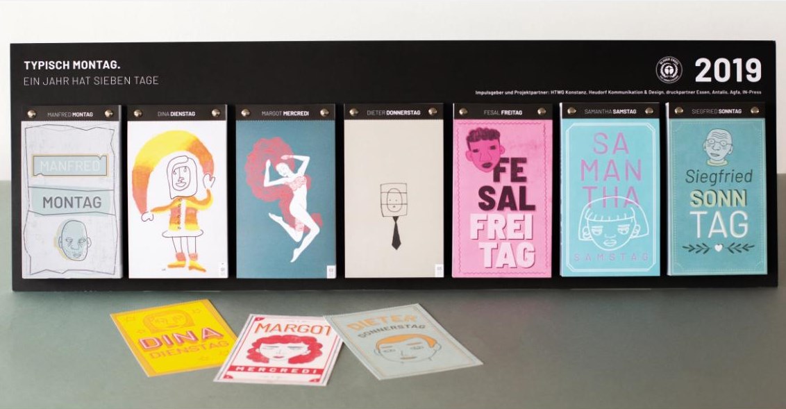 In dem untypischen Kalender mit dem Titel "Typisch Montag – ein Jahr hat sieben Tage" wird an jedem Montag die Geschichte des arbeitssuchenden Manfred in Illustrationen erzählt, Dienstag ist die verträumte Dina dran, Mittwoch die selbstbewusste Margot, der Donnerstag zeigt Dieter und seine Hauskatze, Freitag ist der Paketbote Fesal unterwegs, rebellisch wird’s immer samstags mit Samantha und immer sonntags spaziert Siegfried durch die Natur oder bastelt. Alle Illustrationen sind zum Abreißen und können als Postkarte wiederverwendet werden.