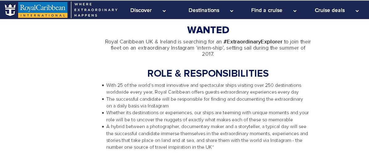 Die Reederei Royal Caribbean UK & Ireland, Spezialist für Kreuzfahrt-Reisen, sucht auf Instagrammer als #extraordinaryExplorer für die Sommermonate "Praktikanten" als Reisebreichterstatter. Dies berichtet das Reise-Newsportal travelnews.ch (https://www.travelnews.ch/cruise/4495-gratis-auf-kreuzfahrt-fuer-instagrammer.html). Auf der Website www.royalcaribbean.co.uk/extraordinary-intern-ship werden reisefreudige, abenteuerlustige Menschen aus UK oder Irland als #extraordinaryExplorer gesucht, die Sinn und Gespür für das Außergewöhnliche haben. Die Aufgabe: In den Sommermonaten 2017 drei Wochen lang auf drei ausgewählten Kreuzfahrt-Linern von Royal Caribbean cruisen und dabei täglich über außergewöhnliche Reiseerlebnisse auf dem Schiff oder an Land via Instagram posten. Der ideale Bewerber ist mindestens 21 Jahre alt, sicher im Umgang mit Instagram, verfügt über Talent in der Fotografie und im Storytelling. Der von einer Jury ausgewählte beste Kandidat erhält neben der Reise sowie der Erstattung aller damit zusammenhängenden Transfer- und Unterhaltskosten noch 3000 englische Pfund als Preisgeld.