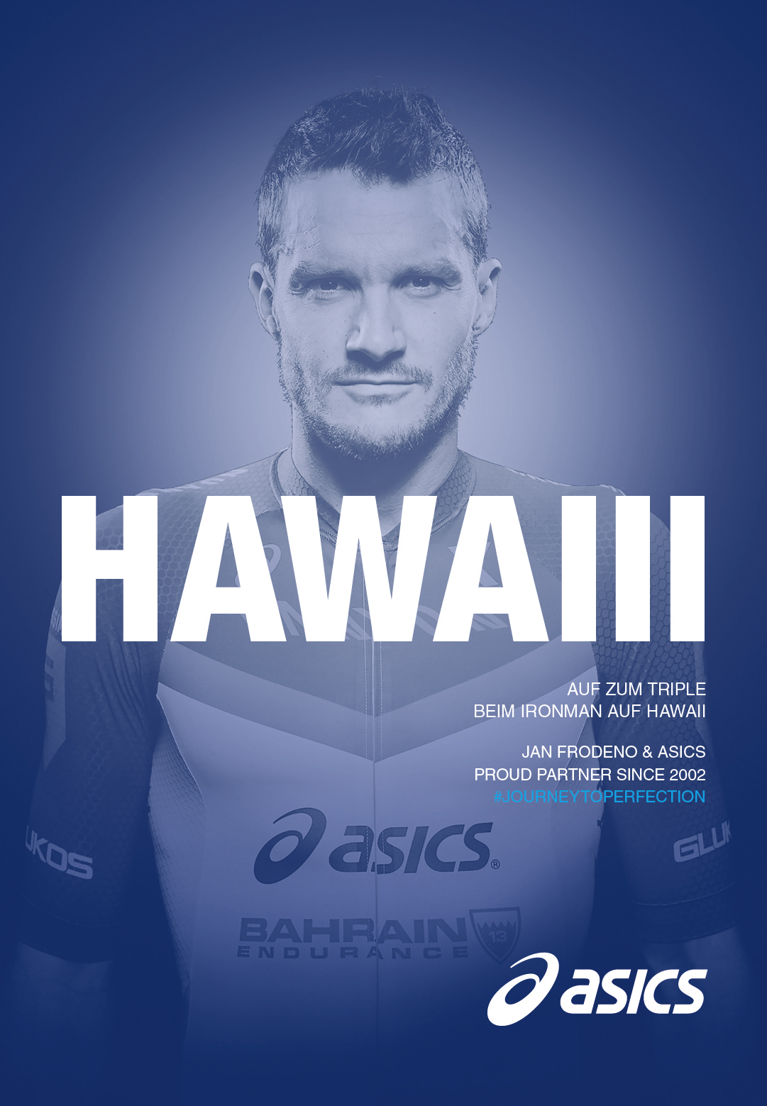 Darin wird der Austragungsort des IRONMAN 2017 auf Hawaii in Anspielung auf das mögliche Triple von Jan Frodeno in Print-Anzeigen kurzerhand in HAWAIII umbenannt. Auf den digitalen Kanälen kommt ein animiertes GIF zum Einsatz, das die 226 Kilometer lange Rennstrecke (3,8km Schwimmen, 180km Radfahren, 42,2km Marathon) in einen ASICS Laufschuh verwandelt – frei nach dem Malen-nach-Zahlen-Prinzip.