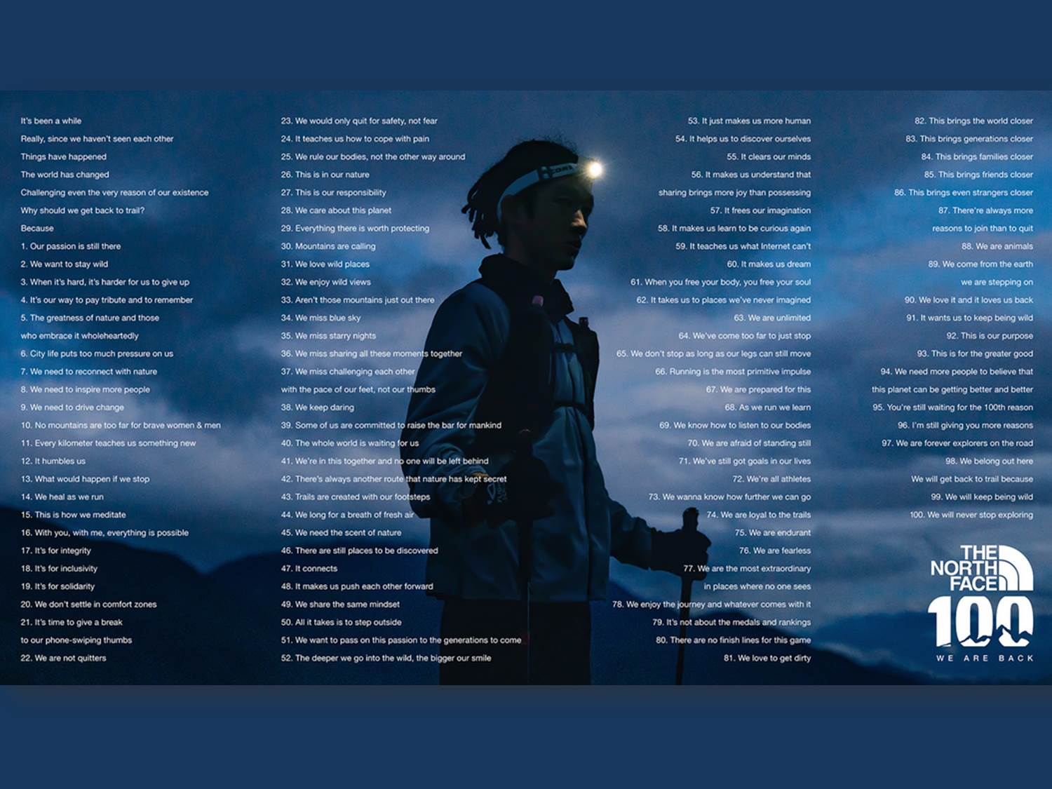 Trotz der massiven Herausforderungen, die in den letzten Jahren zu bewältigen waren, haben The North Face und Fred & Farid Shanghai frische Energie investiert, um das Lauf-Event zu relaunchen und eine integrierte Kampagne (Titel: TNF100 Reasons to get back to trail) zu entwickeln, welche die Widerstandsfähigkeit der Menschen feiert. Die Kampagne verfolgt eine CGC (Customer Generated Content) Strategie. Sie wurde laut Aussagen der Kreativen fast komplett mit Original-Content von 100 professionellen Läufer:innen und Influencer:innen aus der The North Face Community erstellt.