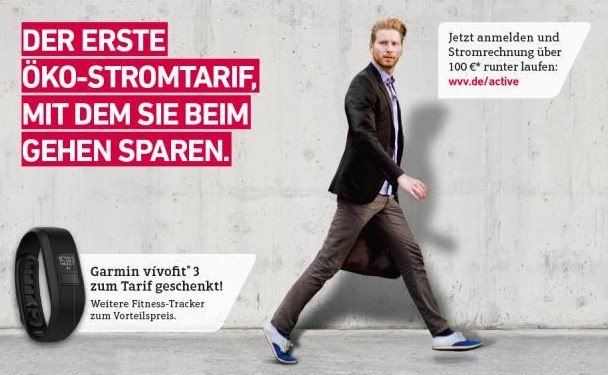 Mit dem Stromtarif WVV Active bekommt jeder Kunde, der täglich mindestens 5000 Schritte läuft, eine Kilowattstunde Strom geschenkt. Über 100 Euro lassen sich so jedes Jahr sparen. Mit dem neuen Tarif will das Stadtwerk auch zeigen, wie es Verantwortung für Gesundheit und Umwelt übernimmt.