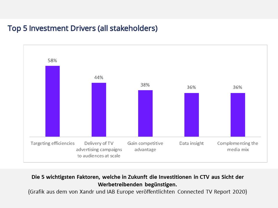 Faktoren, welche die erhöhte Nutzung von CTV als Werbemedium begünstigen sind laut dem Report der rückläufige klassische Fernsehkonsum, die Datenbasierung sowie die daraus resultierenden Möglichkeiten einer effizienteren Zielgruppenansprache. 58 Prozent der befragten Werbetreibenden, Agenturen und Vermarkter gab an, dass die Möglichkeit der gezielten Adressierung ein Schlüsselfaktor bei der Erwägung für den Einsatz von oder die Erhöhung von Investitionen in CTV ist.