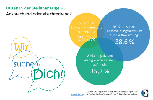 Immer häufiger werden Bewerber von Unternehmen in den Stellenanzeigen geduzt. Vor allem junge, unerfahrene Bewerber und Kandidaten mit Führungserfahrung dürfte der lockere Umgangston verunsichern. In einer aktuellen Umfrage von CareerBuilder Germany gaben 35,2 Prozent der Befragten an, dass das "Du" in der Stellenanzeige abschreckend auf sie wirke. Nur 26,2 Prozent werden bereits hier gerne geduzt. Für 38,6 Prozent ist dieser Aspekt gar kein Entscheidungskriterium für die Bewerbung.