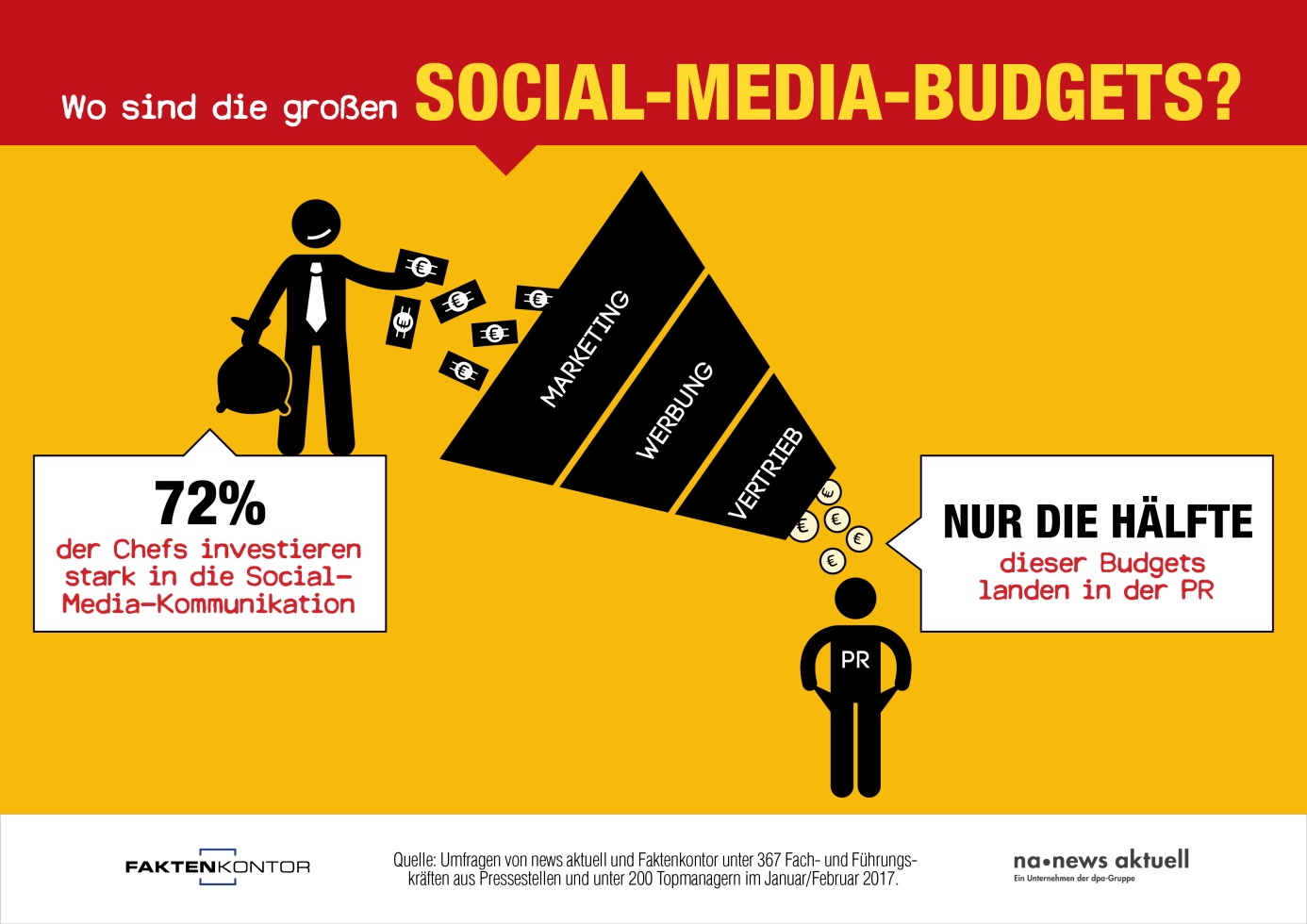 Die Chefetagen deutscher Unternehmen stellen verstärkt Gelder für den Einsatz Sozialer Medien bereit: 72 Prozent befragter Top-Entscheider geben an, dass die Social-Media-Kommunikation in ihrem Unternehmen einen Investitionsschwerpunkt darstellt. Allerdings bekommen die eigenen PR-Profis von dem Geldsegen nur recht wenig mit. Lediglich 38 Prozent befragter Mitarbeiter aus Presseabteilungen sehen in ihrem eigenen Betrieb erhebliche Investitionen in Soziale Medien. Das zeigt eine Umfrage der dpa-Tochter news aktuell und der Kommunikationsberatung Faktenkontor. Befragt wurden im Januar und Februar 2017 insgesamt 200 Geschäftsführer, Vorstände und Führungskräfte aus Unternehmen aller Branchen und Größenklassen sowie 367 Mitarbeiter aus deutschen Pressestellen.