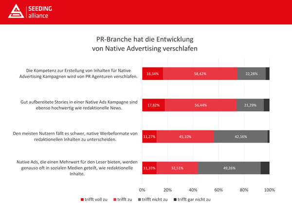 Deutliche Kritik äußern die Branchenexperten in der Befragung an der PR-Branche. Drei von vier Befragten bestätigen, dass die Kompetenz zur Erstellung von Inhalten für Native Advertising Kampagnen von PR-Agenturen verschlafen wird (75 Prozent). Ihrer Meinung nach stellen gut aufbereitete Themen einer Native Ads Kampagne ebenso hochwertige Inhalte dar wie redaktionelle Nachrichten (75 Prozent). Etwas mehr als die Hälfte der Befragten ist sich einig, dass Native Ads in sozialen Netzwerken weniger häufig als redaktionelle Inhalte geteilt werden (56 Prozent). Gleichermaßen glauben die Branchenexperten auch, dass es den Nutzern schwerfällt, native Werbeformate von redaktionellen Inhalten zu unterscheiden (56 Prozent).