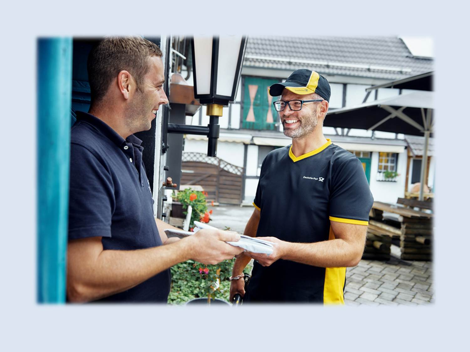 Bildmotiv (Titelbild): Briefzusteller mit Kunde (Bildrechte: Deutsche Post DHL Group)