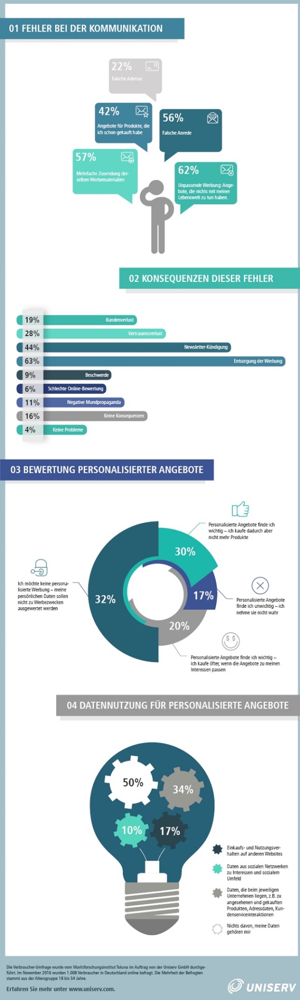 Die Chancen richtig personalisierter Werbung werden laut Uniserv zu wenig genutzt: 50 Prozent der befragten Verbraucher finden Angebote, die auf ihre Interessen zugeschnitten sind, wichtig. 34 Prozent der Befragten möchten, dass Unternehmen ihre Kundendaten (z.B. Produktinteressen, Kaufhandlungen etc.) besser nutzen, um personalisierte(re) Angebote zu unterbreiten. Jeder Fünfte kauft öfter, wenn die Angebote zu seinen Interessen passen.