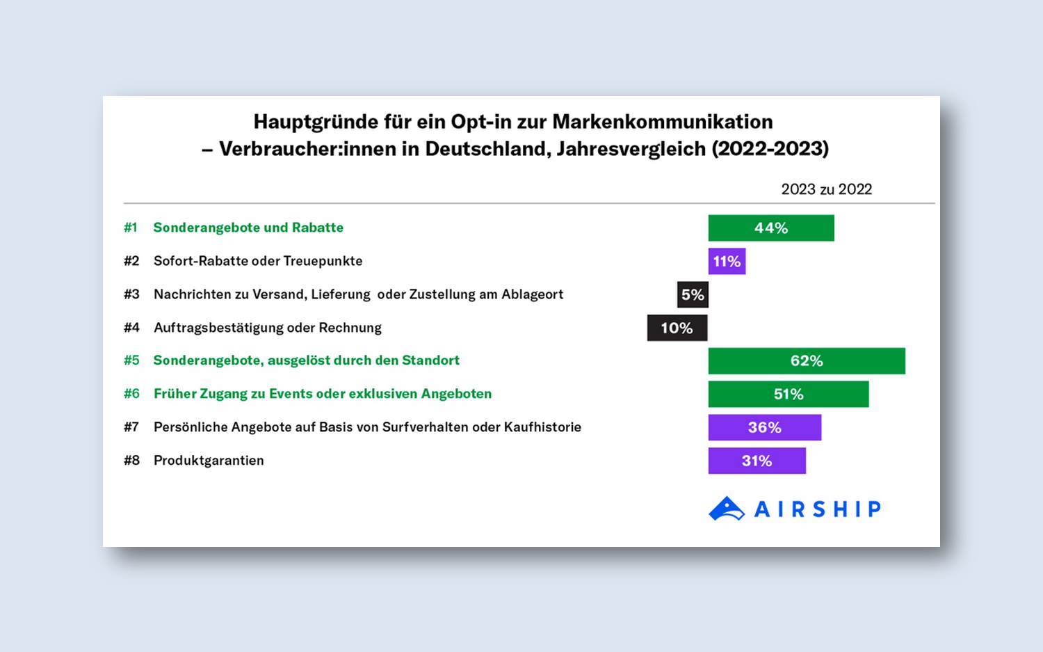 Die Studie ergab ferner, dass die Verbraucher:innen am ehesten bereit sind, mobile App-Benachrichtigungen zu akzeptieren, wenn sie dafür Sonderangebote und Rabatte erhalten. Dieser Grund ist im Vergleich zum letzten Jahr um 44 Prozent gestiegen, was mit der sich verschlechterten wirtschaftlichen Gesamtsituation vieler Menschen zusammenhängen dürfte. Sonderangebote, die durch den Standort ausgelöst werden, sind besonders beliebt und verzeichnen eine Steigerung um 62 Prozent. Die Begründung, einen frühen Zugang zu (Verkaufs-) Events oder exklusiven Angeboten zu erhalten, legte um 51 Prozent zu.