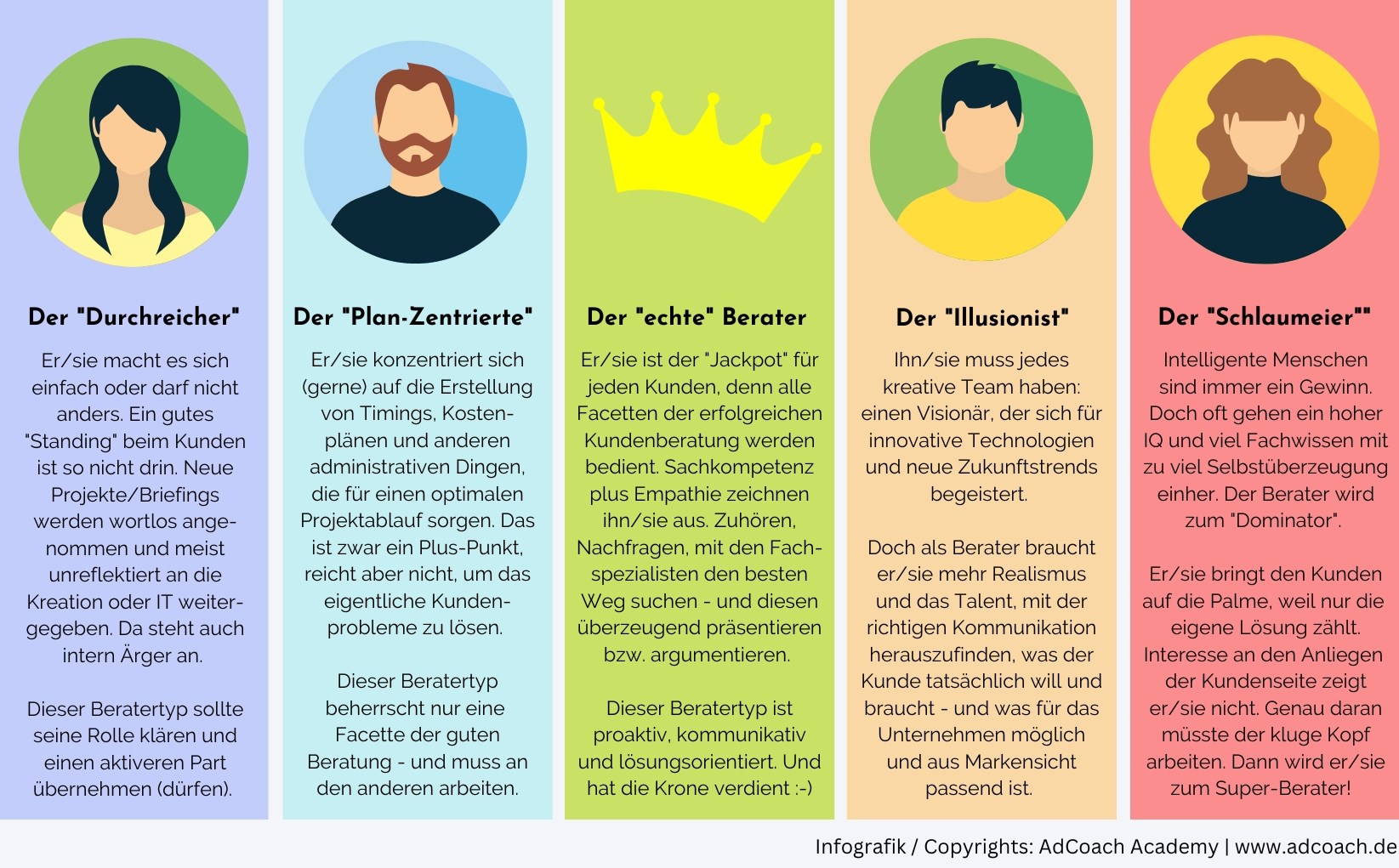 Marketing, Marketingberatung, Beratung, Berater, Beratertypologie, Agentur-Business, Agenturen, Agentur der Zukunft, Agentur Trends, Kreation, ChatGPT, KI-Tools, KI, Kreativ-KI, Text-KI, Design-KI, Client Service, Account Management, Marketing Services, Sales Services, Sales Support, Agenturberatung, Beratungsqualität, Berater Skills, Berater Seminar, Berater Training, Berater Boost Camp, AdCoach Academy, Tipps, Expertentipps, Infografik