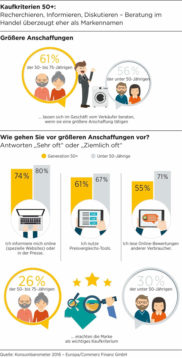 Best Ager kaufen gut informiert, aber nicht impulsiv ein. Dies ist ein zentrales Ergebnis der Studie Konsumbarometer 2016 – Europa, einer repräsentativen Verbraucherbefragung im Auftrag der Commerz Finanz GmbH.