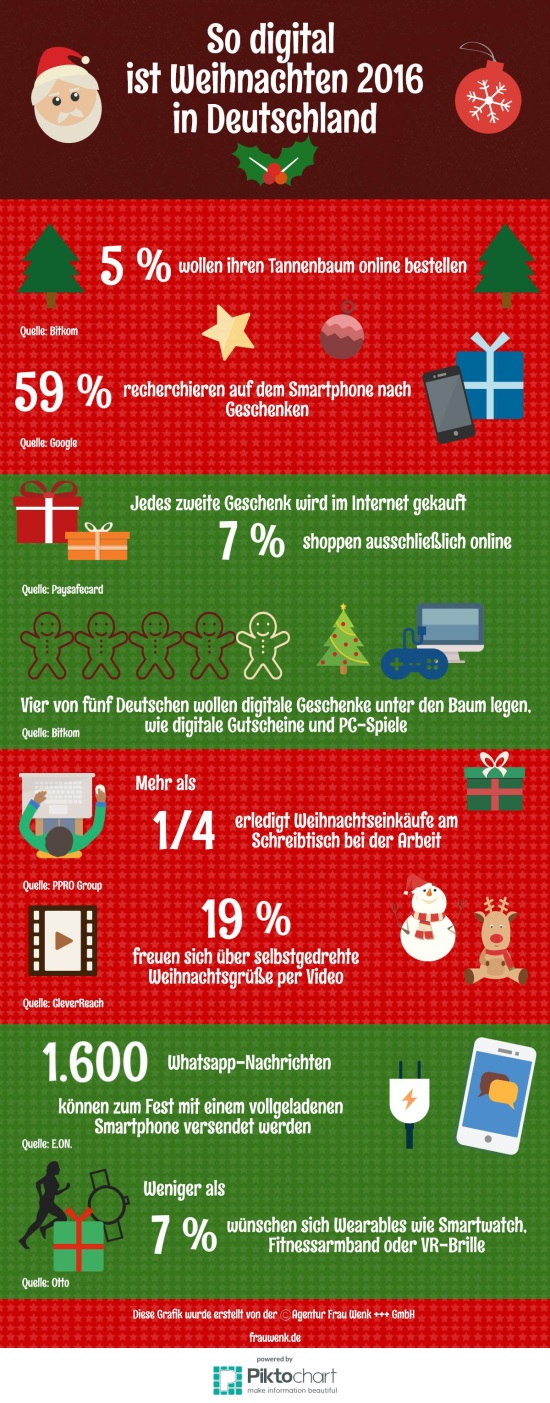 Die Digitalisierung verändert das Leben der Menschen. Anhand des gesellschaftlichen Großereignisses "Weihnachten" hat die PR-Agentur Frau Wenk (www.frauwenk.de) interessante Fakten zur Digitalisierung des Einkaufsverhalten und der Kommunikation zusammengetragen.