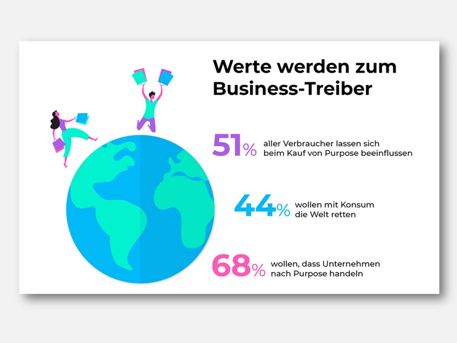 Wer konsumiert, will Verantwortung übernehmen und erwartet das auch von den Lieblingsmarken. 44 Prozent der Befragten sehen sich mit ihrem Konsum in der Verantwortung für die Zukunft unseres Planeten. Und sieben von zehn Personen (68 Prozent) wünschen sich, dass Unternehmen weniger über ihren Purpose reden und stattdessen öfter den Werten entsprechend handeln.